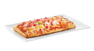 Hefeteig, Tomatensauce, Schinken, Käse, Oregano, Paprika