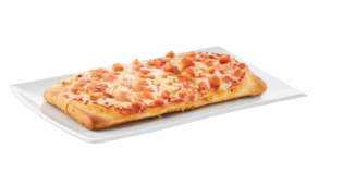 Hefeteig, Tomatensauce, Mozzarella, Tomatenwürfel, Basilikum, Gewürze