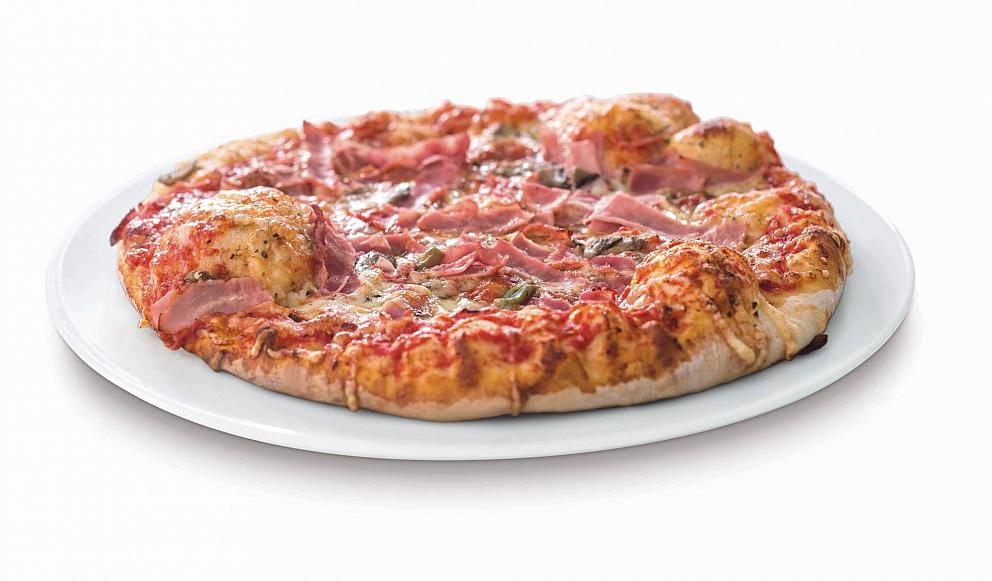 Hefeteig, Tomatensauce, geräucherte Putenbrust, Mais, Tomatenwürfel, Mozzarella, Oregano