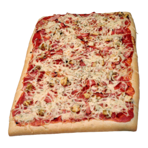 Hefeteig, Tomatensauce, Käse, Speck, Lauch, Knoblauch, Champignons, Tomatenwürfel, Oregano