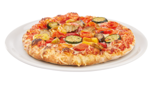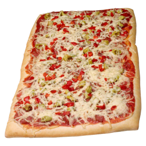 Hefeteig, Tomatensauce, Käse, Auberginen, Zucchini, Paprika, Oliven