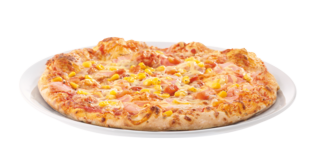 Hefeteig, Tomatensauce, geräucherte Putenbrust, Mais, Tomatenwürfel, Mozzarella, Oregano